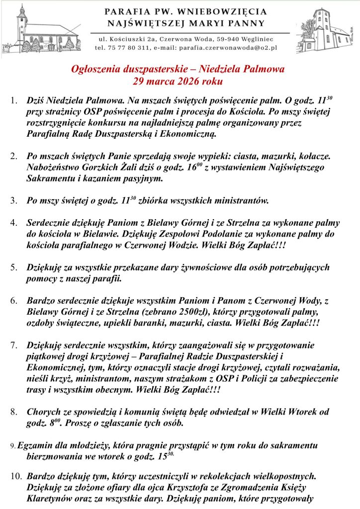 Ogłoszenia Duszpasterskie – Niedziela Palmowa – 29 marca 2026