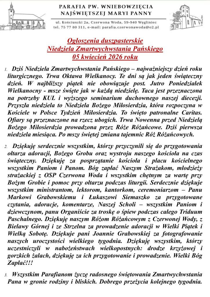 Ogłoszenia duszpasterskie – Niedziela Zmartwychwstania Pańskiego – 5 kwietnia 2026 roku